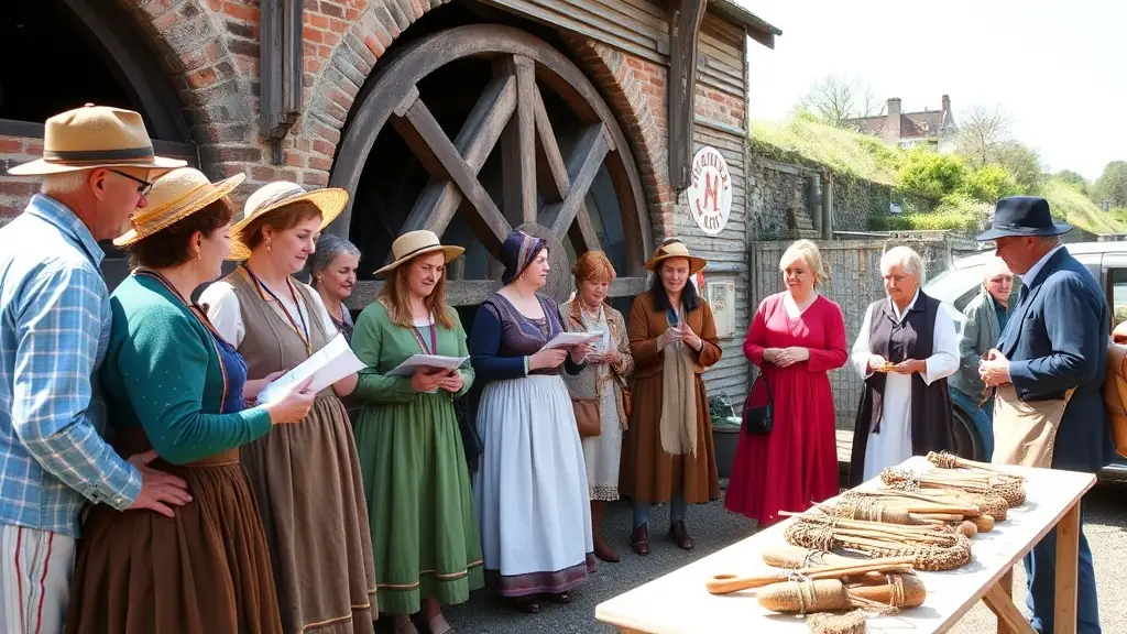 A lively scene from a cultural event held at the tidal mill, featuring traditional music, local crafts, and community members enjoying the festivities.